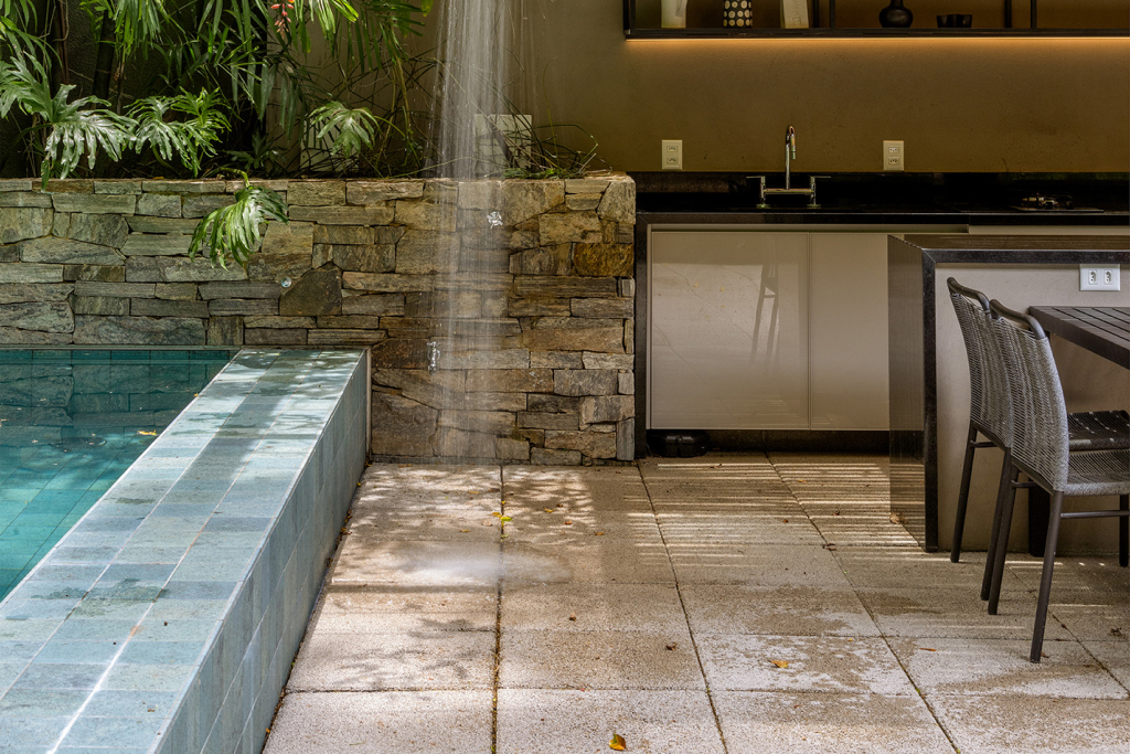Nas áreas próximas à piscina, o acabamento do piso também precisa garantir segurança aos usuários. Superfícies com texturas que ofereçam um coeficiente de atrito adequado são indispensáveis para proporcionar estabilidade em situações de umidade, evitando escorregamentos sem causar incômodos ou comprometer a experiência ao caminhar descalço.
